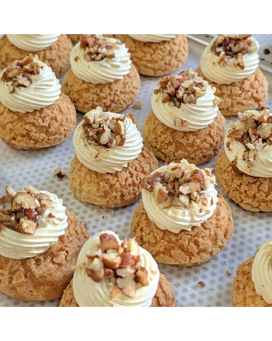 Composition: pâte à choux, craquelin, crémeux caramel, praliné noix de pécan, ganache montée vanille