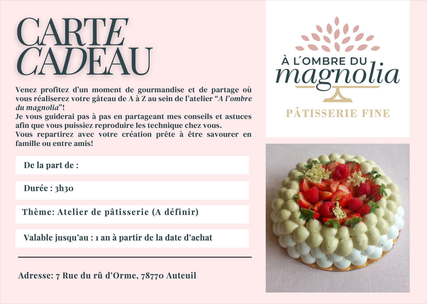 Avec la carte cadeau A l’ombre du magnolia, faites découvrir des desserts raffinés, généreux et pleins de saveurs. Que ce soit pout un anniversaire, une célébration, ou simplement pour un offrir un moment de douceur, cette carte fera plaisir autant par le geste que par le goût !