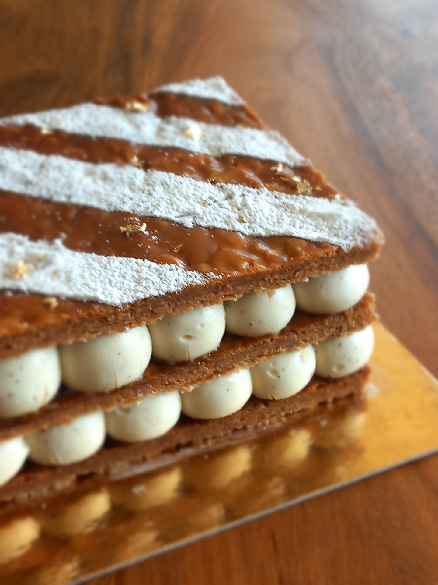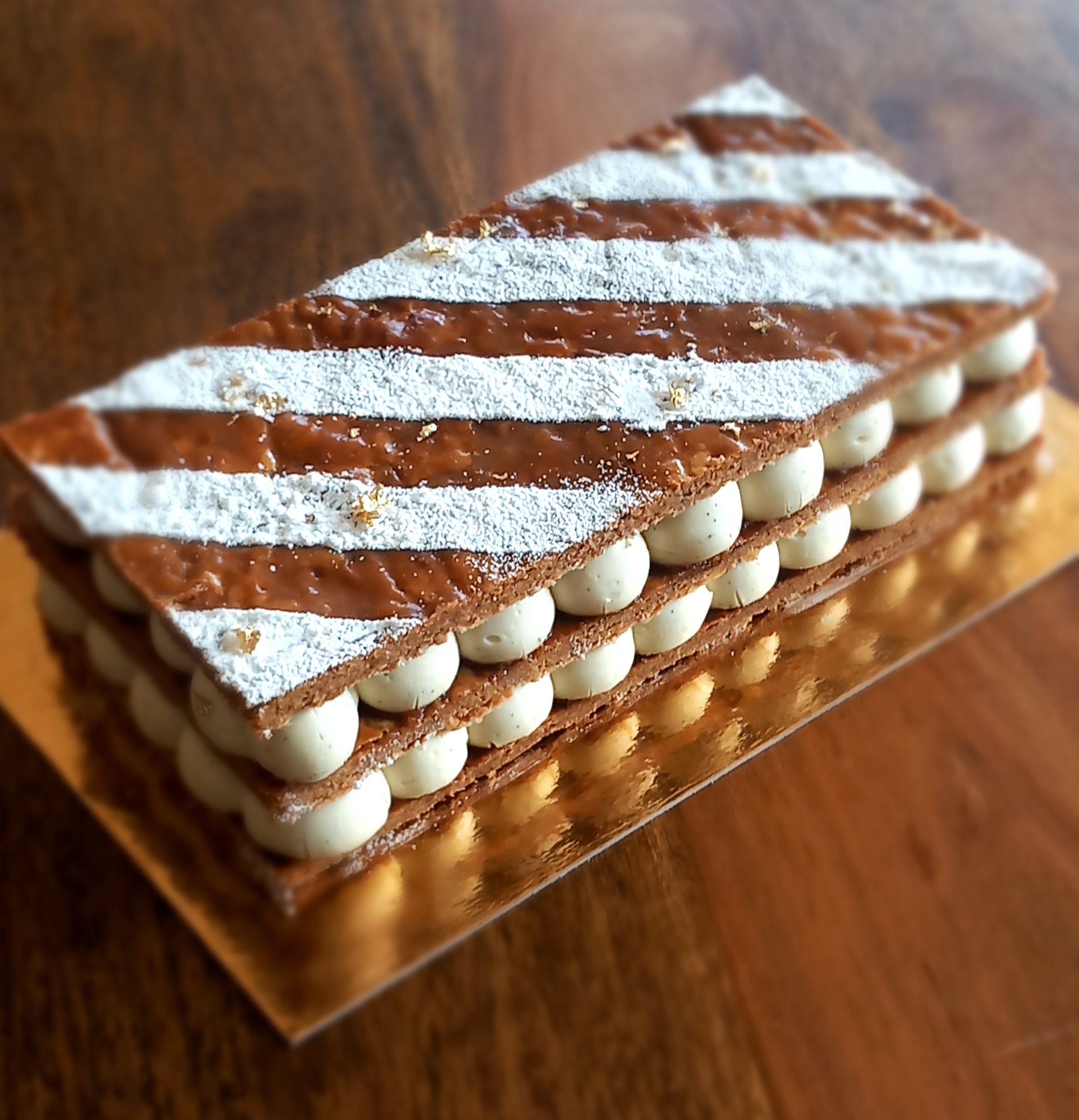Composition: pâte feuilletée inversée caramélisée, crème diplomate vanille, crémeux caramel, sucre glace