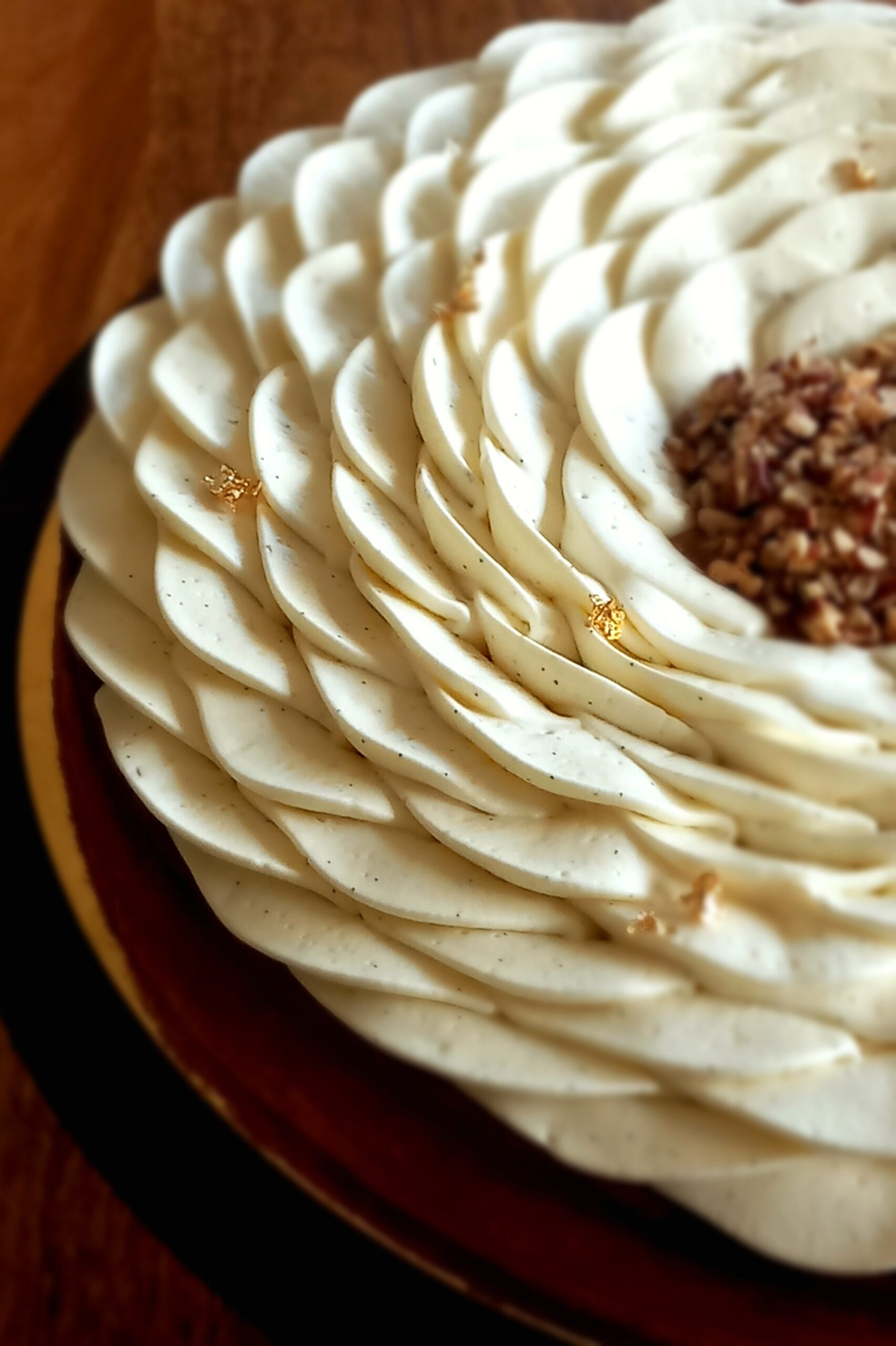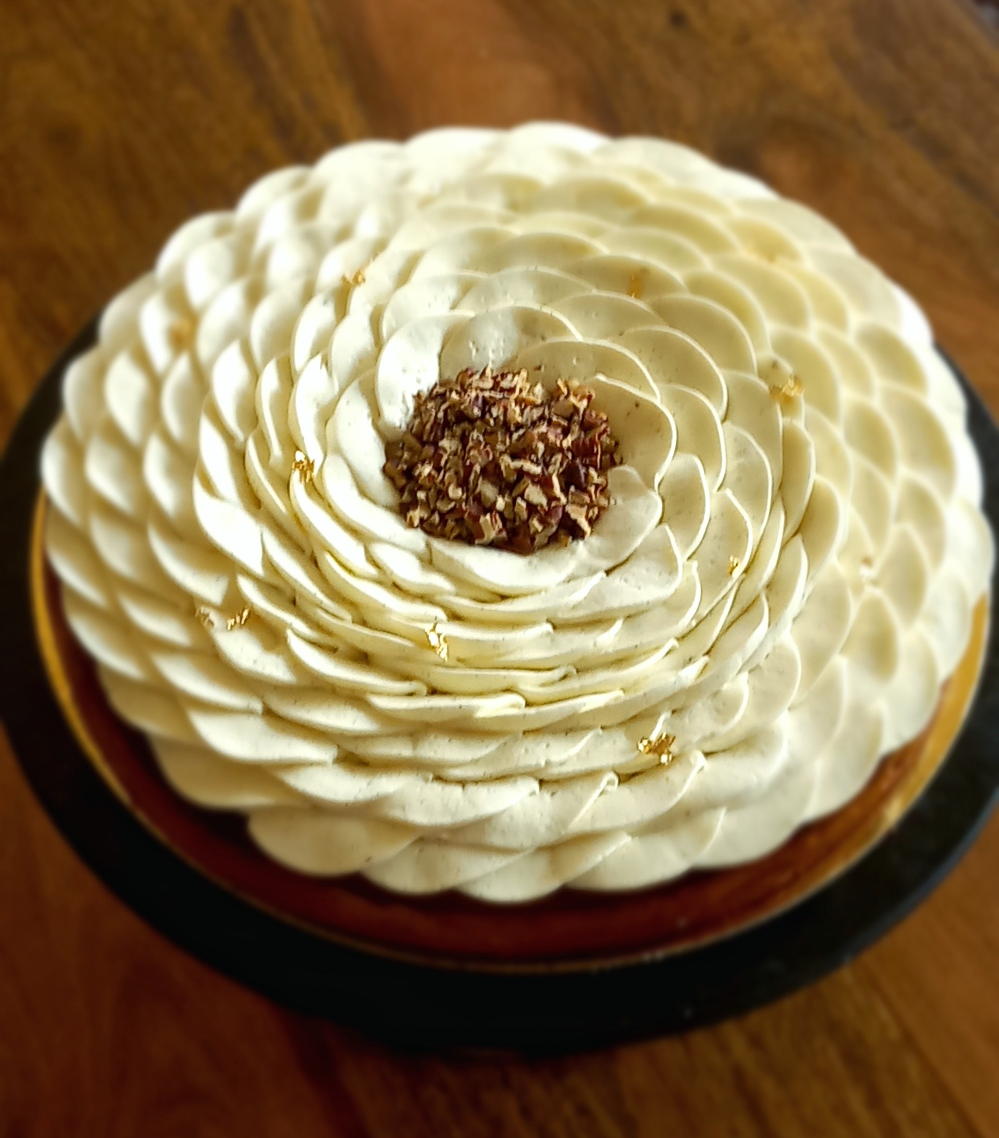Composition: pâte sucrée, crème de noix de pécan, croustillant praliné noix de pécan, crémeux caramel, ganache montée vanille.